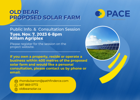 Should you have any further questions or require more information, please go to PACE's website at www.oldbearsolar.ca Additionally, Rhonda Barron is the representative for the proposed Solar Farm project, and is available personally if you prefer to speak to a person. She can be reached at 587-869-0772 or email: rhonda.barron@pathfinderce.com