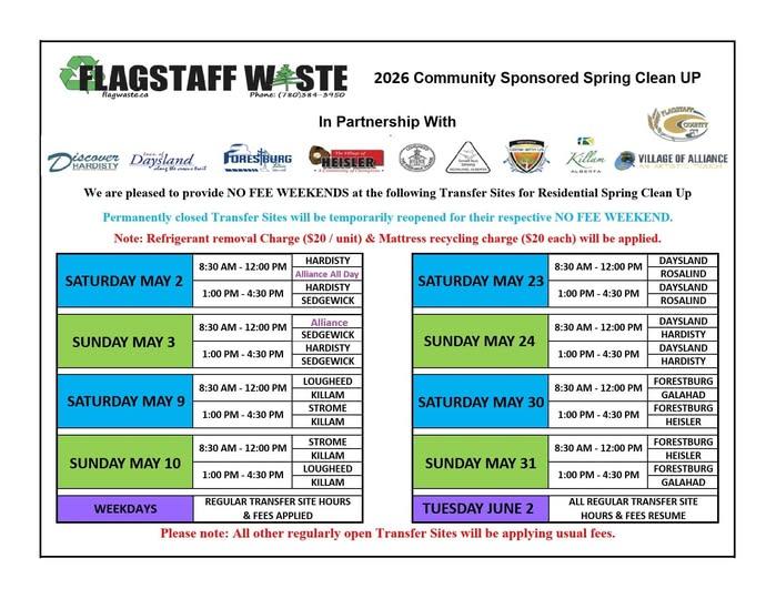 The FEE Free Spring Cleanup is typically held in the beginning of May, at the Killam Transfer Site. There will be no fee for regular household garbage these 2 days. (The $20 charge will still apply to refrigerants and mattresses). The Killam Site is located east of the Viterra elevator on Highway 13, then north at Range Road 133. Please watch for dates near the spring!